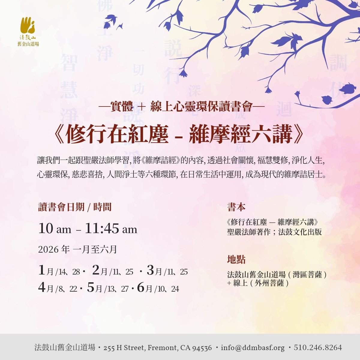 Let us learn together from our teacher, Master Sheng Yen, how to apply the teachings of the Vimalakīrti Sūtra to our daily lives through six interconnected aspects, including caring for society, cultivating both virtues and wisdom, purifying our lives, protecting our spiritual environment, practicing loving-kindness, compassion, joy in others’ happiness, and equanimity, and building a Pure Land in the human world—so that we ourselves may become modern Vimalakīrti lay practitioners.