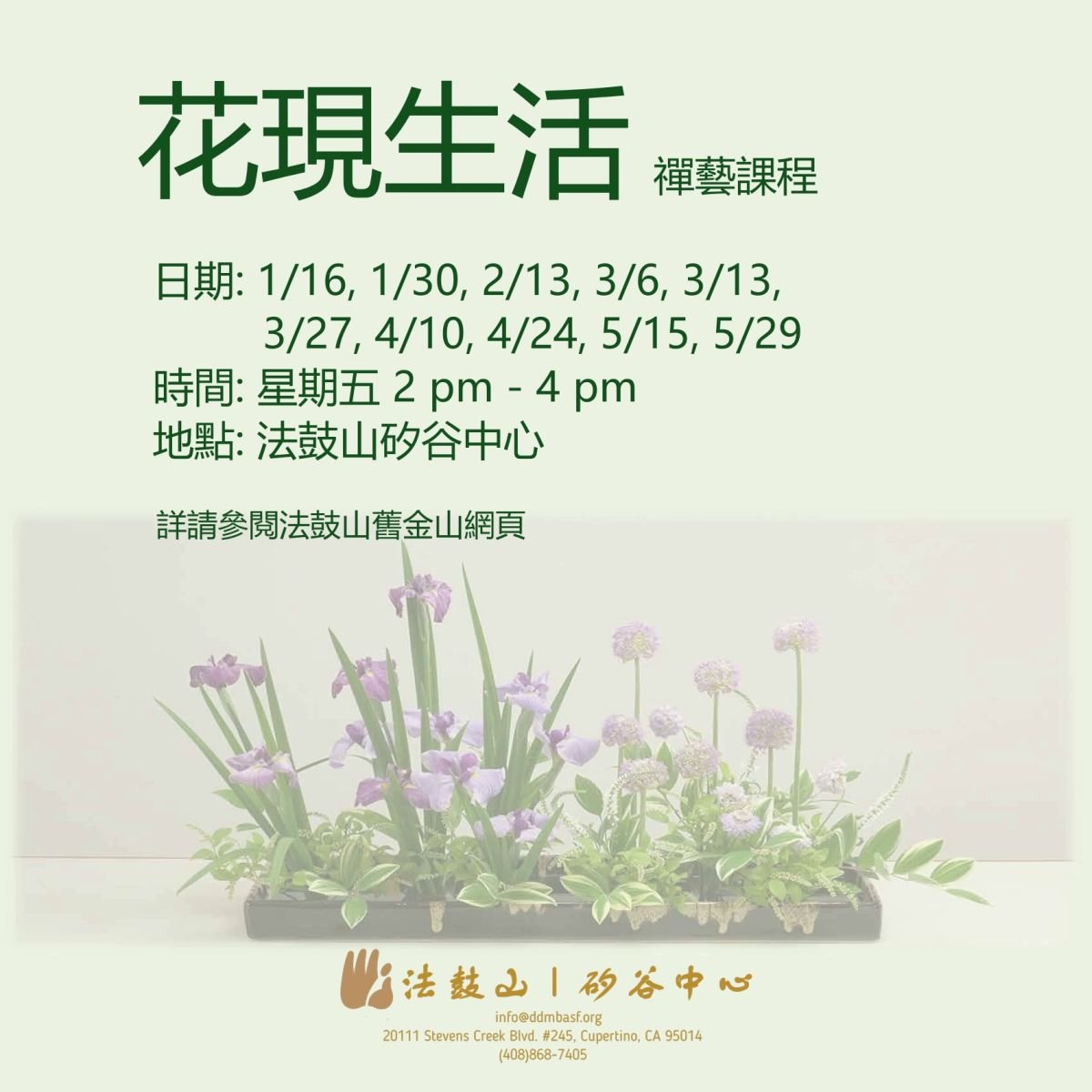 【Fee】Class fee of $20 per session, to be donated to Dharma Drum Mountain San Francisco Center (donation receipt available), as well as Flower material fee of $15 per session payable together with class fee at registration.