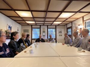 在接待廳裡,大家享用著精緻的日式茶點並彼此交流。前任方丈關老師首先提起,非常懷念聖嚴師父曾經到訪過禪中心,並和方丈和尚果暉法師分享到佛法非常簡單,所謂真即是假,假即是真,真真假假,假假真真,一切如虛幻泡影,最終都是一樣的。新任方丈為大家介紹禪中心致力於曹洞宗「只管打坐」的方法,用靜坐和禪修的方法來達到開悟。他們提供的課程包括講經、誦經、禪修指引、讀書會,以及一日到三十日、甚至為期更長的禪修,以滿足社區及來自各地各種不同修行者的需求。不過新冠疫情之後,大家習慣於網路上課,很多人、尤其是年紀較長者,都選擇在家學習,較少來禪中心了,他覺得很可惜。禪修還是面對面、當面指導,進步才比較快。另外很多人來禪中心都只關注能不能開悟,做義工則興致缺缺。方丈和尚果暉法師建議,想要開悟還是要勸大家多修福修慧,多種福田。禪中心新任方丈也請教方丈和尚,如何才能讓佛法久住?方丈和尚用致贈給禪中心的「福慧自在」書畫為題,帶出「安己和眾六字訣」,勉勵大家要將「輕、鬆、慢、細、小、分」應用在生活中,讓生活更自在、慈悲有智慧,這就是讓佛法久住。