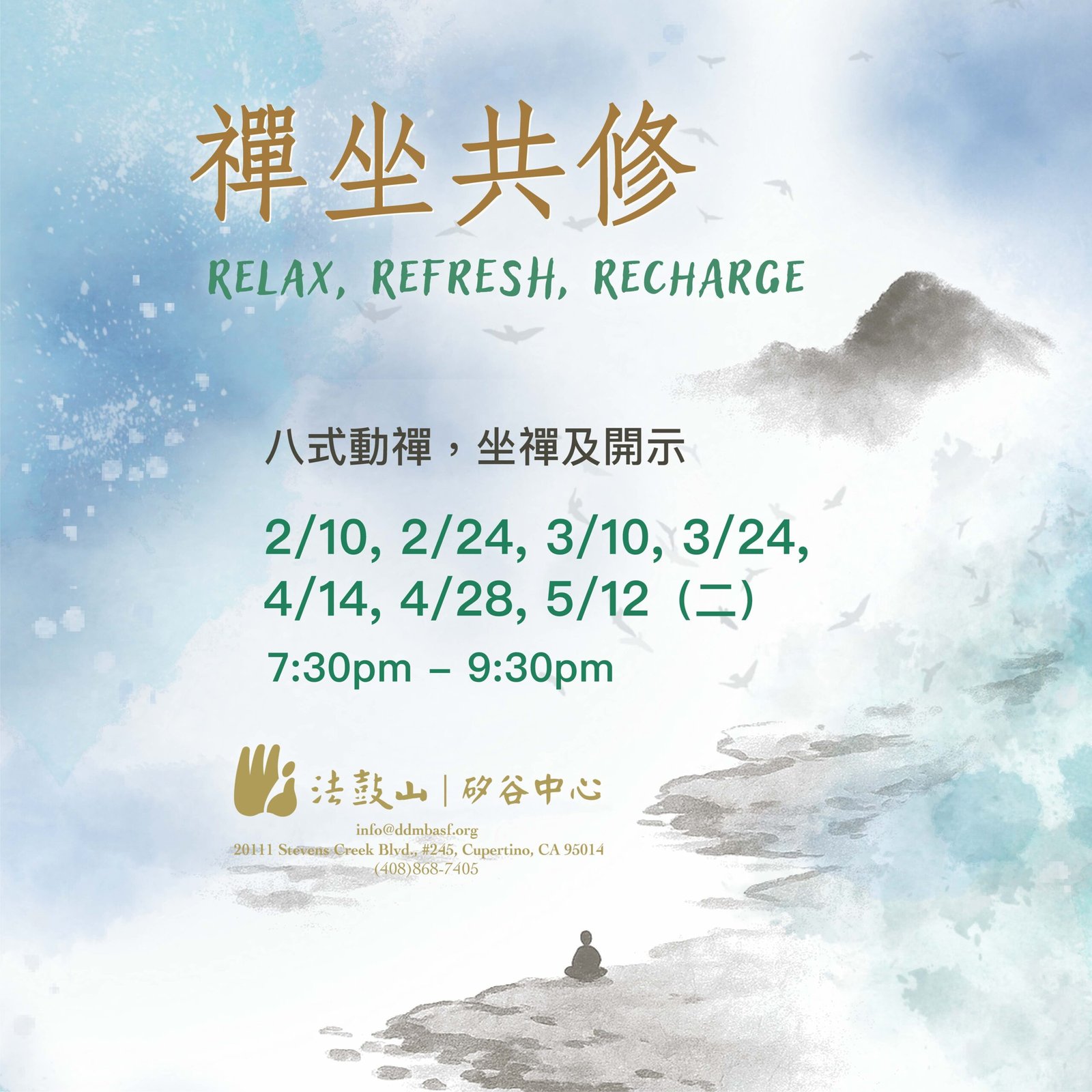 十字街頭好禪修 —— 矽谷中心週二晚上的《禪坐共修》,邀請您給自己兩小時,體驗 Relax ,Refresh,Recharge 的過程,將身放鬆,心安定,時時可用的充電方法,融入您的矽谷生活中。
